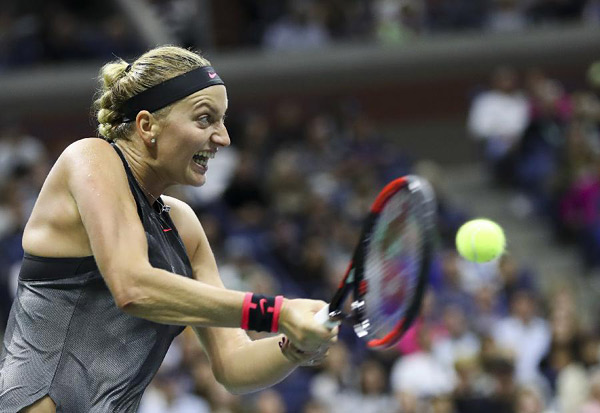 美国网球公开赛9月3日开始了第四轮的争夺,在一场针尖对麦芒的女单对攻战中,捷克球星科维托娃以7:6(3)和6:3力克三号种子、西班牙人穆古拉扎挺进八强。不过,最具人气的明星莎拉波娃大满贯复出之路在当日比赛戛然而止,她在对阵拉脱维亚球手塞瓦斯托娃的比赛中,犯下多达51次非受迫性失误,被后者淘汰出局。图为科维托娃在比赛中回球。