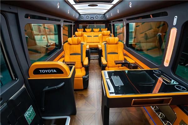 丰田考斯特棚顶的改装更是点睛之笔。柔和的LED氛围灯带沿着顶棚蜿蜒,可调节的色温与亮度让车内空间在不同场景下切换自如——会议时冷白光营造专业氛围,休闲时暖黄光增添温馨感。顶棚还巧妙集成了隐藏式储物格,方便收纳随身物品,保持车内整洁。