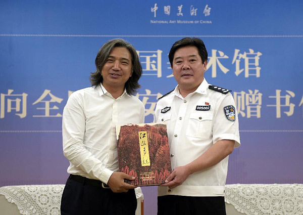 9月4日,中国美术馆在北京开展向全国公安系统赠书活动。中国美术馆馆长吴为山(左)向中国人民公安大学校长曹诗权赠送样书。近日,中国美术馆分批次将馆内珍存的展览大型图书画册面向全国各省级图书馆(美术馆)、部分高校以及革命老区、贫困地区等相关机构进行赠送,旨在普及审美、典藏活化、资源共享、互助互动。截至目前已完成向39家单位赠书,共赠送画册102种,合计1400多册。