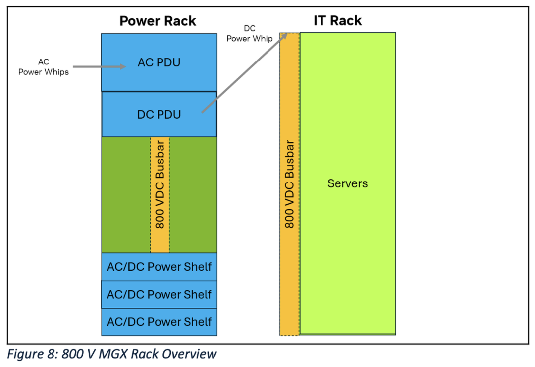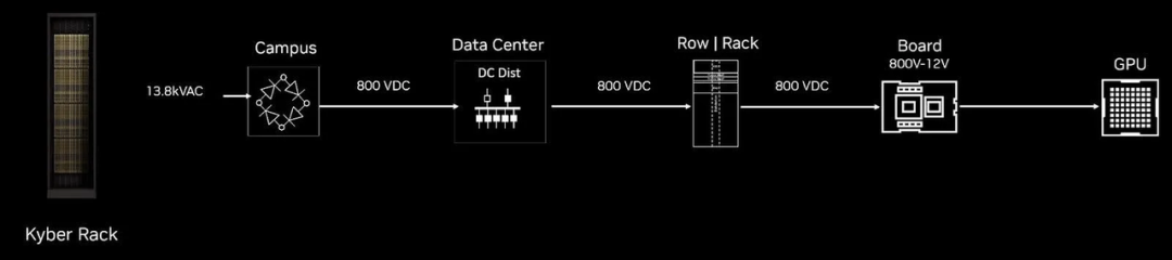 NVIDIA 最新推出的 Kyber 机架架构,将 800V 直流直接分配至各节点,通过单级转换实现更高的空间利用率和能源效率。