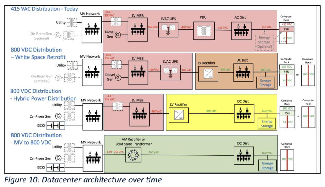 直流系统还减少了对相位平衡设备和变压器的依赖,使架构更简单、更可靠。由于电动汽车和光伏发电早已广泛使用 800V 及以上直流系统,其产业链和安全标准已相对成熟,数据中心可以直接借鉴这些经验,加快落地进程。